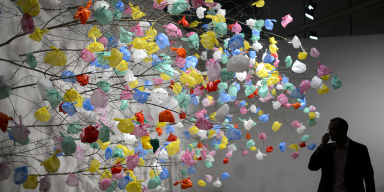 Ne vous fiez pas à ce ton faussement clément. L’ironie de Tayou est mordante. Elle nous claque au visage comme le Boomerang, qui a donné le titre à son exposition cet été au Bozar de Bruxelles. Il y avait exposé un nuage de coton d’où sortaient des pieux acérés, référence aux esclaves des plantations mais aussi à la pollution. Car les œuvres de Tayou sont à multiples fonds. Ses jolis fétiches en verre emmaillotés de tissus ou barrés de bouts de bois sont tout en rage contenue. « Je suis un parfait sauvage,reconnaît-il. Et je tiens à ma sauvagerie. »